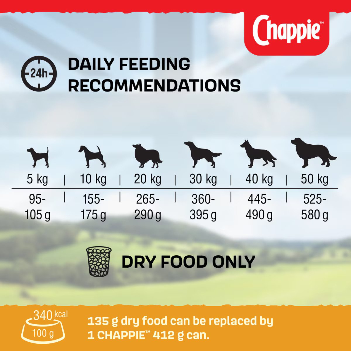 An individual dog’s requirements may differ according to its level of activity, breed and physical condition. Therefore you may adjust the amount of food to keep your dog in an optimal condition. Most dogs take some time to adapt to a change in diet. When introducing your dog to CHAPPIE®, do so gradually over a period of 5 days. CHAPPIE® Complete may be fed dry or may be moistened with warm water or gravy. Keep fresh drinking water available.